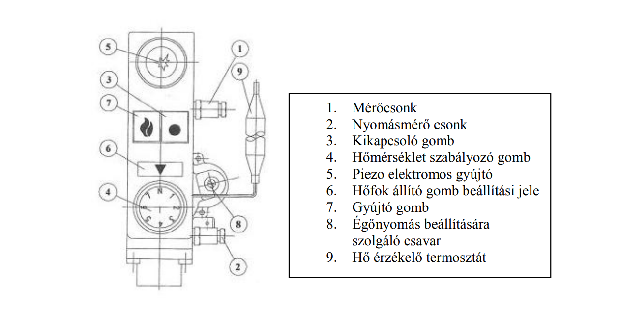 Ütközésig teljesen nyomja le az ON-gombot (BE-gomb), gyújtsa meg az őrlángot (azáltal, hogy benyomja a piezoelektromos szikragyújtó gombját), tartsa benyomva az ON-gombot kb. 5 másodpercig, majd engedje el azt. Ha égve marad az őrláng, akkor az égő gázellátását szabályozó fő nyomócsonk gázszelepe vagy nyitva, vagy zárva marad, attól függően, hogy a termosztát mekkora hőmérsékletet érzékel.