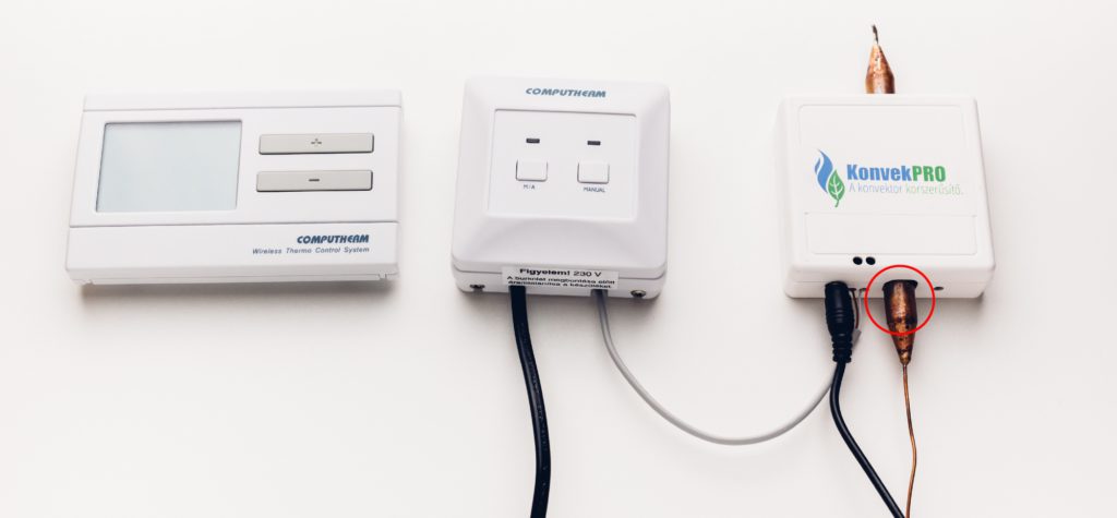 A KonvekPRO-t rögzítse a falra a konvektor mellé olyan távol, amilyenre a konvektor csőtermosztátja engedi. A gázkonvektor csőtermosztátját óvatosan szabadítsa ki, majd dugja be a KonvekPRO-ba. Kösse össze egy két-eres vezetékkel a KonvekPRO-t és a szobatermosztátot. Állítsa gázkonvektora szabályzógombját a 6,5 – 7-es fokozatra. Programozza be a szobatermosztáton a kívánt fűtési ciklusokat. Egy szobatermosztátra több gázkonvektor is ráköthető. Több KonvekPRO egy termosztáthoz való kapcsolásakor ügyeljünk, hogy a KonvekPRO-k termosztátcsatlakozóit polaritás-helyesen kössük össze, a jobb oldali csatlakozópontokat a jobb oldali csatlakozópontokkal, a bal oldali csatlakozópontokat a bal oldali csatlakozópontokkal. A termosztátba (vezeték nélküli termosztát esetén annak adó részébe) a közösített jobb és bal oldali vezetékeket tetszőlegesen kötheti be.